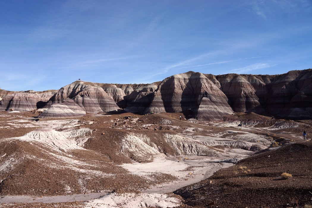 Petrified Forest National Park gets its name from the conifers that have turned to stone over millions of years, way back to the Late Triassic Epoch, about 225 million years ago. The mix of sediments throughout the landscape are part of the colorful Chinle Formation which is where Painted Desert gets its name from.