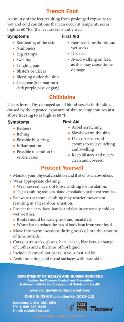 Being able to recognize the signs of frostbite and hypothermia could save your or your friend’s life, or earlobe. Thanks to the Centers for Disease Control and Prevention and the National Institute for Occupational Safety and Health (NIOSH) for this informative sheet: