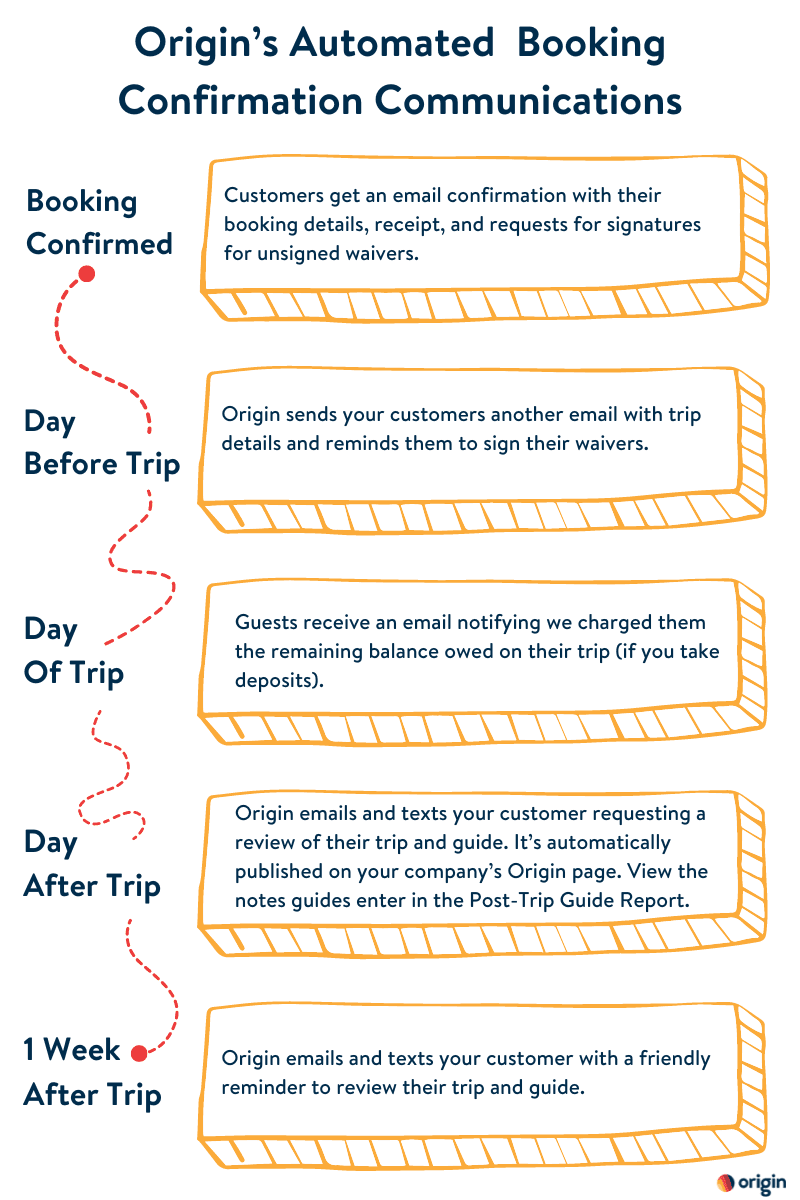 When you’re on Origin, you don’t have to set up any triggers or templates—they’re built into the system. Check out the graphic below to see the various booking confirmation communications the system automatically sends on your behalf.