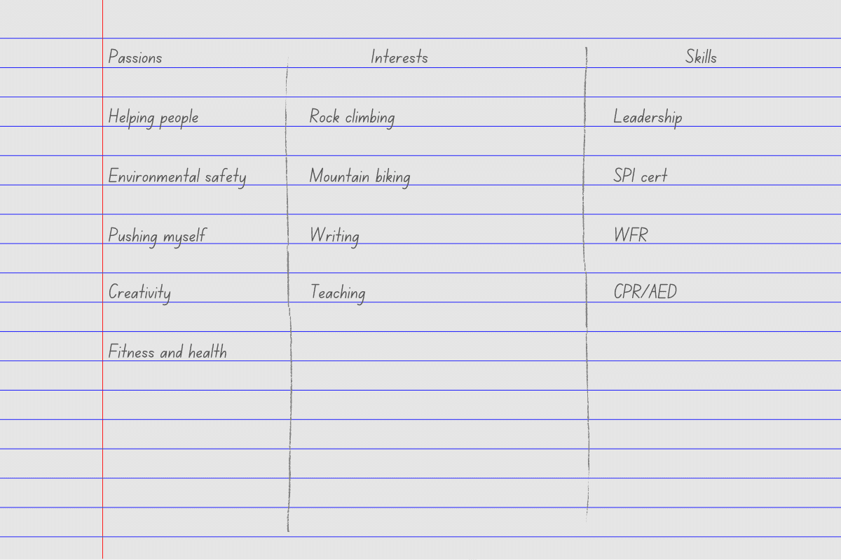 When you’re listing your passions, interests, and skills, make three columns on a piece of paper then write the numbers one through 10 down the sheet. Try to fill it out entirely and when you’re done, you’ll have 30 things.
