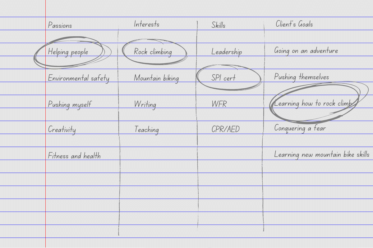1. List all your passions, interests, and skills (try to list 10 of each). What certifications do you already have? What do you like to do for fun? What would you like to do knowing the client comes first?