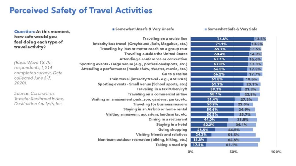 While numbers suggest that travelers are starting to fly more (87,534 on April 14th to 441,255 eon June 7th), 48% of Americans are not comfortable flying until the pandemic is over. This impacts tour operators significantly when there aren’t people coming in from out-of-state to explore. This suggests that tour operators will need to rely heavily on local tourism instead.