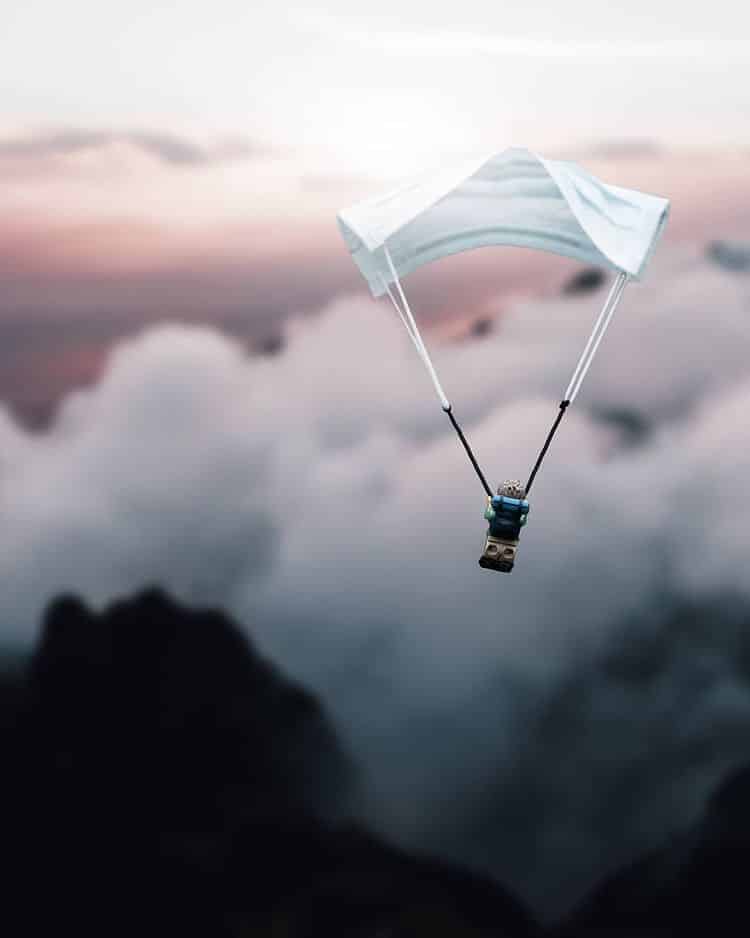 Connor Naasz (@cjnaasz) takes it up a notch with an action shot. Here we see Lego Guy paragliding through fluffy clouds and tall mountains.
